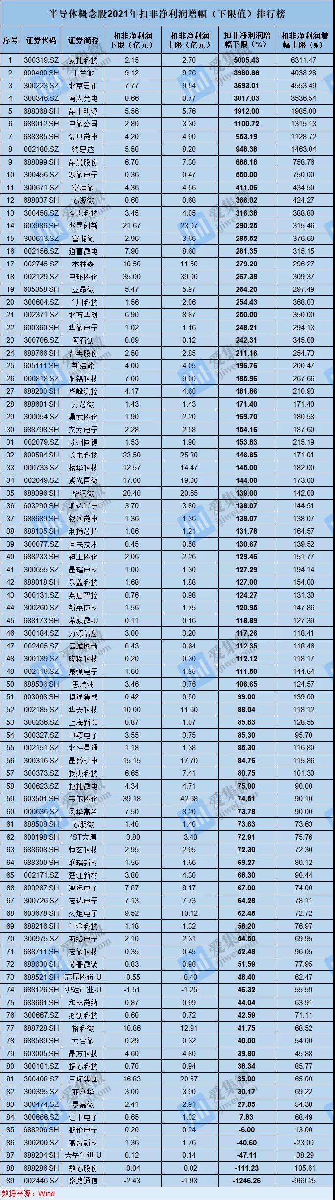 扣非后凈利潤(rùn)同比增幅(下限值)在200-1000%的上市公司有18家,分別是復(fù)旦微電、納思達(dá)、晶晨股份、賽微電子、富滿(mǎn)微、芯源微、全志科技、兆易創(chuàng)新、富瀚微、通富微電、木林森、中環(huán)股份、立昂微、長(zhǎng)川科技、北方華創(chuàng)、華微電子、阿石創(chuàng)、普冉股份,其扣非凈利潤(rùn)增幅分別為953.19%、948.38%、688.18%、550%、411.06%、366.02%、316.38%、290.25%、285.52%、281.35%、279.20%、267.38%、264.20%、254.43%、250%、248.21%、242.31%、211.16%。