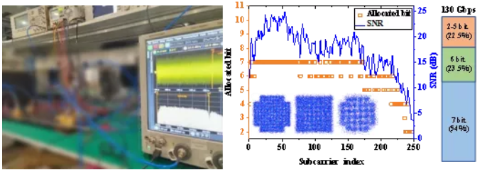 太赫茲通信被認為是6G移動通信的核心技術(shù)之一,粵通院200GHz全固態(tài)電子太赫茲系統(tǒng)解決了傳輸損耗大、頻率帶寬不足、器件非線性等科研難點,搭建了適合于大帶寬太赫茲無線通信的全套物理層傳輸系統(tǒng),并采用創(chuàng)新的自適應(yīng)裁剪比特功率加載離散多音(DMT)調(diào)制技術(shù)提升了系統(tǒng)的使用帶寬和頻譜效率,全帶寬平均譜效率達到了6.1bit/s/Hz,最終在21.32GHz信號帶寬下實現(xiàn)單通道傳輸速率超過130Gbps。