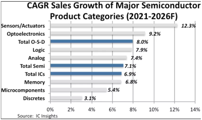 IC Insights還預測2021-2026年光、傳感器、分立器件(OSD 器件)的總復合年增長率將保持8.0%的健康增長率,IC總銷售額預計將以略低的6.9%的速度增長。預計主要半導體產品類別的復合年增長率從傳感器/執(zhí)行器的12.3%到分立器件的3.1%不等。