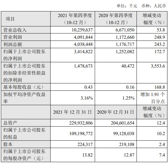 2021年第四季度歸屬于上市公司股東的扣除非經(jīng)常性損益的凈利潤(rùn)較上年同期增長(zhǎng),主要由于銷(xiāo)售收入增加所致。
