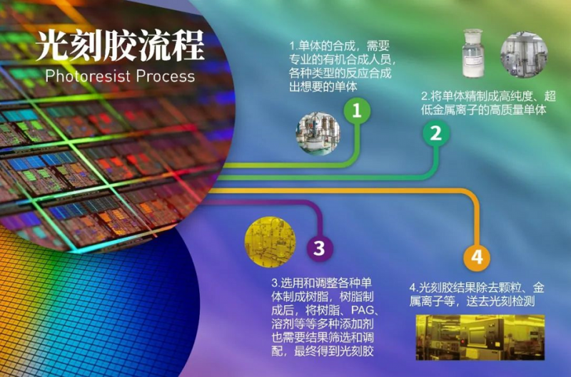 光刻膠是芯片生產(chǎn)過程中的核心原材料之一,用于晶圓制造中的光刻工藝。其中,樹脂是光刻膠最重要的組成部分,光刻膠樹脂不是大眾化的聚合物,必須由專門的供應(yīng)商定制生產(chǎn)或光刻膠廠家自行生產(chǎn),而光刻膠單體則是合成樹脂的原料。