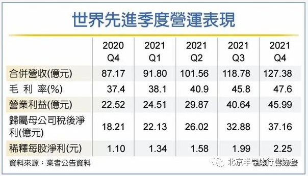 去年第四季世界先進(jìn)合并營(yíng)收季增7.2%達(dá)127.38億元,年增46.1%,續(xù)創(chuàng)季度營(yíng)收歷史新高;平均毛利率季增1.8個(gè)百分點(diǎn)達(dá)47.6%,年增10.2個(gè)百分點(diǎn);營(yíng)業(yè)利益季增13.2%達(dá)45.99億元,與前年同期相較則成長(zhǎng)104.2%;歸屬母公司稅后凈利季增13.0%達(dá)37.16億元,年成長(zhǎng)104.0%,創(chuàng)下季度獲利新高,稀釋每股凈利2.25元。