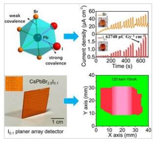 此外,該研究團(tuán)隊通過布里奇曼法生長了一系列厘米級CsPbBr3-nIn單晶,提高了CsPbBr3單晶的電阻率,降低了缺陷態(tài)密度,抑制了離子遷移,使得探測器在500 V偏壓下仍能穩(wěn)定工作并有著較低的暗電流,實(shí)現(xiàn)了對120 keV硬X射線穩(wěn)定的響應(yīng),探測靈敏度高達(dá)6.3×104 μC Gy–1 cm–2,最低檢測限低至54 nGy s–1。相關(guān)成果以Ultrasensitive and Robust 120 keV Hard X-ray Imaging Detector based on Mixed-Halide Perovskite CsPbBr3-nIn Single Crystals為題發(fā)表在Advanced Materials(影響因子:30.849)上。山東大學(xué)2019級博士研究生張鵬為論文的第一作者,陶緒堂教授和張國棟副教授為論文的共同通訊作者。山東大學(xué)是上述所有論文的第一完成單位。