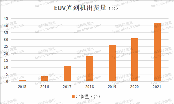 近年來,ASML銷售的EUV光刻系統(tǒng)數(shù)量持續(xù)增長。從2015年第一臺EUV光刻機出貨,到2021年,ASML已成功交付42套EUV光刻系統(tǒng)。ASML表示,隨著芯片制造工藝愈加先進,預(yù)計未來邏輯芯片、DRAM都將采用EUV技術(shù)制造,未來EUV光刻機的需求仍持續(xù)增長。在現(xiàn)有條件下,預(yù)計2022年將產(chǎn)出55臺EUV光刻系統(tǒng),EUV系統(tǒng)的收入也將增長25%。