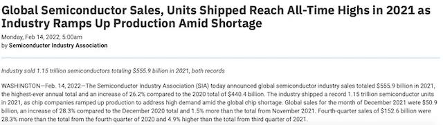 近日,美國(guó)半導(dǎo)體行業(yè)協(xié)會(huì)(SIA)在其官網(wǎng)上發(fā)布最新數(shù)據(jù)。數(shù)據(jù)顯示,2021年全球半導(dǎo)體市場(chǎng)銷(xiāo)售額總計(jì)5559億美元,同比增長(zhǎng)26.2%,創(chuàng)下歷史新高。