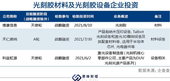 就如同一盤棋局,下棋者必得在關(guān)鍵處落子,才能穩(wěn)占優(yōu)勢(shì)。華為深諳此道,也在積極布局光刻膠和光刻機(jī)相關(guān)產(chǎn)業(yè)。光刻膠材料領(lǐng)域,華為哈勃入股光刻膠單體產(chǎn)業(yè)化生產(chǎn)商博康信息;光刻機(jī)設(shè)備領(lǐng)域,華為哈勃投資的天仁微納擁有Talbot光刻設(shè)備,科益虹源則是光刻機(jī)核心零部件公司。