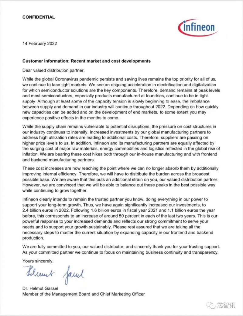 據(jù)業(yè)內(nèi)人士在某微信群分享的一份文件顯示,汽車(chē)芯片大廠英飛凌已于當(dāng)?shù)貢r(shí)間2月14日向經(jīng)銷(xiāo)商發(fā)出了一封名為《客戶(hù)信息:近期市場(chǎng)與成本動(dòng)態(tài)》的通知,計(jì)劃對(duì)旗下產(chǎn)品進(jìn)行漲價(jià),不過(guò)具體哪些產(chǎn)品線(xiàn)上漲,以及漲價(jià)幅度并未透露。