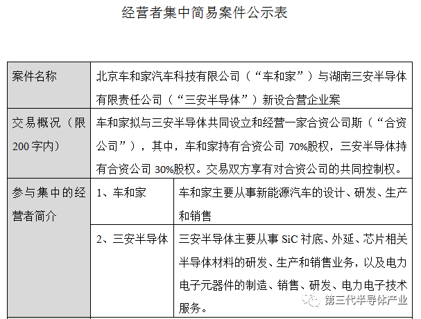 2月23日,據(jù)媒體稱:國家市場監(jiān)督管理總局反壟斷局的經(jīng)營者集中簡易案件公示顯示,北京車和家汽車科技有限公司(簡稱:車和家)與湖南三安半導(dǎo)體有限責(zé)任公司(簡稱:三安半導(dǎo)體)將成立合營企業(yè)。