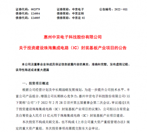 惠州中京電子科技股份有限公司發(fā)布公告稱,公司擬以自有資金及自籌資金人民幣15億元用于珠海集成電路(IC)封裝基板產(chǎn)業(yè)項目建設(shè)。