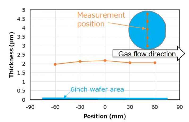 另外,通過(guò)成膜條件的優(yōu)化和采用獨(dú)自的原料噴嘴結(jié)構(gòu),證實(shí)了在6英寸測(cè)試晶片上的β-Ga2O3成膜,以及確認(rèn)了能夠?qū)崿F(xiàn)β-Ga2O3膜厚分布±10%以下等在面內(nèi)均勻的成膜(圖3)。通過(guò)本成果確立的大口徑基板上的成膜技術(shù)和硬件設(shè)計(jì)技術(shù),可以構(gòu)筑β-Ga2O3成膜裝置的平臺(tái),因此大口徑批量生產(chǎn)裝置的開發(fā)可以取得很大進(jìn)展。這樣,通過(guò)β-Ga2O3成膜工藝和應(yīng)用設(shè)備帶來(lái)的功耗降低,預(yù)計(jì)在2030年將達(dá)到21萬(wàn)kL/年左右的節(jié)能量。