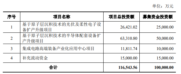 微導(dǎo)納米此次擬募集資金10億元,扣除發(fā)行費(fèi)用后將用于基于原子層沉積技術(shù)的光伏及柔性電子設(shè)備擴(kuò)產(chǎn)升級(jí)項(xiàng)目、基于原子層沉積技術(shù)的半導(dǎo)體配套設(shè)備擴(kuò)產(chǎn)升級(jí)項(xiàng)目、集成電路高端裝備產(chǎn)業(yè)化應(yīng)用中心項(xiàng)目、以及補(bǔ)充流動(dòng)資金。