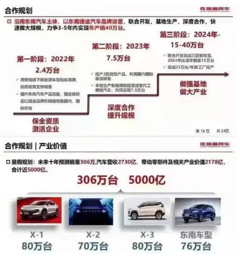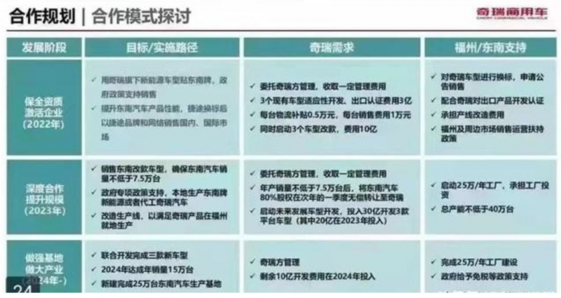 2023年,奇瑞為東南汽車投產(chǎn)三款改型產(chǎn)品,同時本地生產(chǎn)東南牌新能源或代工奇瑞車型,共同實現(xiàn)7.5萬臺的銷量目標,完成目標后奇瑞商用車即可控股東南汽車。