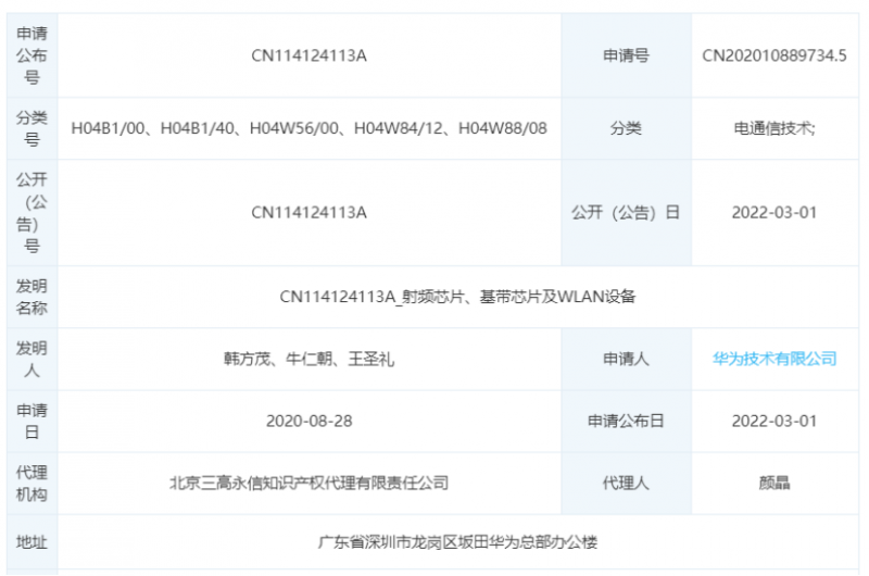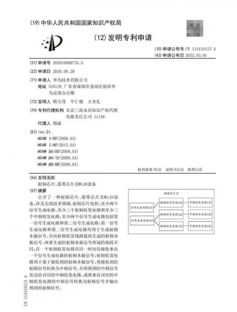 近日,華為技術(shù)有限公司公開了“射頻芯片、基帶芯片及 WLAN 設(shè)備”專利,公開號(hào)為CN114124113A。