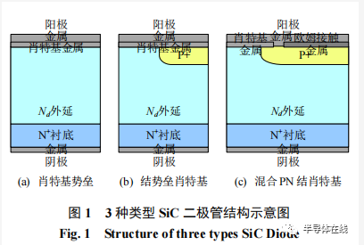 SiC 功率二極管有 3 種類型:PiN 二極管、肖特基二極管(Schottky barrier diode,SBD)和結(jié)勢壘肖特基二極管(junction barrier Schottky diode,JBS),3 種類型的二極管結(jié)構(gòu)如圖 1 所示。JBS 二極管結(jié)合了肖特基二極管在正向?qū)ㄇ闆r下單極型導(dǎo)電的優(yōu)點及 PiN 結(jié)二極管反向漏電流較低的優(yōu)點,在4.5kV 阻斷電壓以下通常采用此結(jié)構(gòu)。2001 年第一款商業(yè)化 SiC JBS 二極管進(jìn)入市場,目前國外廠商Cree、ST 及 Infineon 公司都已推出了 0.6~1.7kV 的SiC JBS 二極管產(chǎn)品,最大電流為 50A,Rohm 采用推出了 0.6~1.2kV 的 SBD 二極管產(chǎn)品,最大電流為40A。