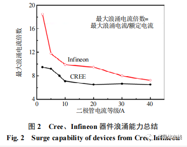 目前 SiC 二極管已大量運用于商業(yè)化的電能轉(zhuǎn)換裝置中。在高壓大容量裝置在啟動的過程中,存在大電流沖擊過程,該應(yīng)用對二極管的抗浪涌沖擊能力提出了挑戰(zhàn)?;旌?PN 結(jié)肖特基二極管(mergedPiN Schottky diode)是在 JBS 二極管的基礎(chǔ)上提出的優(yōu)化結(jié)構(gòu),通過加入大面積 P 區(qū)以及 P 型歐姆接觸的設(shè)計,可以將浪涌電流能力提高 2~4 倍。通過設(shè)計以及工藝上的改進(jìn),各廠家二極管的浪涌能力普遍達(dá)到額定電流的 10 倍以上。而 Infineon通過元胞優(yōu)化,其浪涌電流密度達(dá)到了 5600A/cm2的水平,為額定電流的 18 倍。Cree 和 Infineon 公司的 1.2kV 二極管產(chǎn)品的抗浪涌電流能力的數(shù)據(jù)如圖 2 所示。