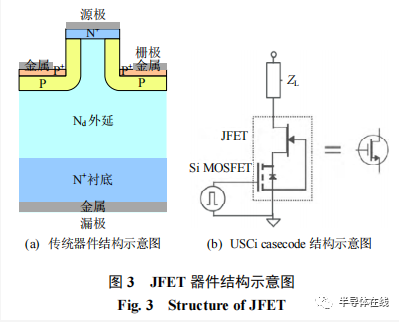 SiC JFET 器件利用柵極 PN 結(jié)耗盡層實現(xiàn)開關(guān)控制,同時正常狀態(tài)下單極性導(dǎo)電,器件擁有良好的高頻特性。其一種形式的器件結(jié)構(gòu)如圖 3(a)所示,其閾值電壓通過頂部 SiC 寬度以及兩側(cè)注入的 P 區(qū)決定。2008 年美國 SemiSouth 公司發(fā)布了第一款常閉型 JFET 之后,同年羅格斯大學(xué)報道了擊穿為1.65kV、比導(dǎo)通電阻為 1.88mΩ.cm 2 的常通型 SiCTI-JFET 器件,2009 年 Sheridan 研制了 1.9kV 的常閉型 SiC JFET 器件,比導(dǎo)通電阻為 2.8mΩ.cm 2。國內(nèi)研究 SiC JFET 器件的公司以及研究機(jī)構(gòu)較少。中國電子科技集團(tuán)公司五十五所利用自主生產(chǎn)的SiC 外延材料,研制出 1.2~4.5kV 常關(guān)型 SiC JFET,最大單芯片電流容量達(dá) 25A。浙江大學(xué)研制出4.5kV SiC JFET 器件,正向電流達(dá)到 2.8A。