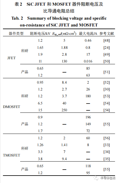 2018 年瀚薪公司將肖特基二極管集成到MOSFET 結(jié)構(gòu)中代替原有 PiN 體二極管,提高了器件體二極管導(dǎo)通能力,并且避免了少子復(fù)合而造成的產(chǎn)生基平面缺陷的風(fēng)險[36]。隨著技術(shù)的成熟,國外產(chǎn)業(yè)界已逐步推出大電流的 MOSFET 器件,Rohm公司發(fā)布650V/≤118A,1.2kV/≤95A的器件。Cree 公司推出了最大電流分別為 900V/≤ 196A,1.2kV/≤ 149A,1.7kV/≤ 72A 的器件。3.3kV 及以上電壓等級的器件暫時還未推出成熟的產(chǎn)品,仍然在進(jìn)行研發(fā)工作。ABB 公司完成了 3.3kV/100A 的SiC MOSFET 器件的研制。Cree 公司推出了3.3kV/45A 的,并逐步推向市場,Mitsubishi 報道了 6.5kV/45A 的 SiC MOSFET 器件。3.3~6.5kV的器件主要針對風(fēng)力發(fā)電以及高鐵的應(yīng)用場合,然而器件的容量只能滿足風(fēng)力發(fā)電的需求,但對高鐵的容量需求仍有差距。而在高壓 MOSFET 方面 Cree公司技術(shù)較為領(lǐng)先相繼推出了 15kV/8A、10kV/10A以及 10kV/20A 的器件,但電流等級較實際應(yīng)用環(huán)境如直流輸電等仍有較大的差距。究其原因主要在于:1)高耐壓器件由于外延較厚,在生長工藝中更易引入缺陷;2)MOSFET 器件柵氧部位對缺陷較為敏感可靠性存在問題。表 2 是近期 SiC JFET和 MOSFET 器件特性的總結(jié)。在 MOSFET 器件中DMOSFET 能避免溝槽角落電場聚集的問題,因而適合高壓的環(huán)境,而 TMOSFET 減小了 JFET 區(qū)域的電阻且溝道電阻也能適當(dāng)減小,更適合低壓的環(huán)境。JFET 器件導(dǎo)通特性優(yōu)于 MOSFET,但存在難以控制的問題。