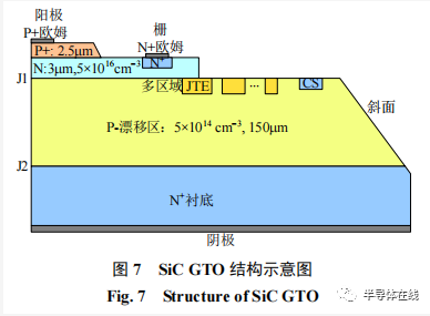 在高壓器件中 IGBT 擁有較好開關(guān)速度,但是由于柵氧結(jié)構(gòu)的存在,在制作大電流器件時不可避免地存在良率低,可靠性差的情況。柵極可關(guān)斷晶體管(gate turn-off thyristor,GTO)可以避免這個問題。GTO 器件由于可以從陽極和陰極兩側(cè)同時注入少子,因此可以得到更高的電流密度,結(jié)構(gòu)如圖 7所示。2012 年 Cree 公司研制 GTO 其耐壓達(dá)到22.1kV。2015 年北卡州立大學(xué)研制出首個正反向阻斷耐壓對稱且都達(dá)到 4kV 的 GTO 器件。