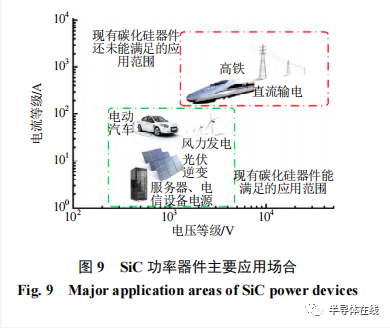 前文論述了各類器件的特性和發(fā)展歷史,圖 8展示了目前已報道的 SiC 各類型器件的阻斷電壓和比導(dǎo)通電阻的分布情況。在實際碳化硅的應(yīng)用場合如圖 9 所示:光伏逆變模塊主要使用 0.6~1.2kV,電流等級在 20A 以上的器件;電動汽車模塊主要使用 0.6~1.2kV,電流等級在 20~50A 的器件;風(fēng)力發(fā)電主要使用 1.2~3.3kV,電流等級高于 20A 的器件;高鐵應(yīng)用場合中則需要 3.3~6.5kV,電流不低于100A 的器件;直流輸電的應(yīng)用場合中需要大于6.5kV 電壓等級且導(dǎo)通電流大于 100A 的器件。具體各類器件的優(yōu)勢和不足在表 4 中列出。