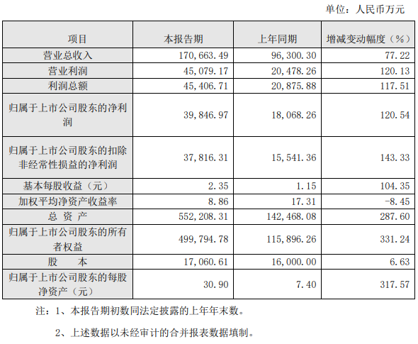報(bào)告期內(nèi),公司營(yíng)業(yè)收入、營(yíng)業(yè)利潤(rùn)、利潤(rùn)總額、歸屬于上市公司股東的凈利潤(rùn)均有較大幅度的增長(zhǎng),增長(zhǎng)的主要原因?yàn)楣景盐帐袌?chǎng)機(jī)遇,不斷擴(kuò)大業(yè)務(wù) 規(guī)模,公司經(jīng)營(yíng)業(yè)績(jī)實(shí)現(xiàn)較快增長(zhǎng)。報(bào)告期末公司總資產(chǎn)、歸屬于上市公司股東的所有者權(quán)益較期初增長(zhǎng)的主要原因?yàn)?2021年度公司非公開(kāi)發(fā)行人民幣普通股(A 股)10,606,060 股,扣除發(fā)行費(fèi)用(不含稅)后的募集資金凈額為 3,476,950,527.96元,使得公司總資產(chǎn)、歸屬于上市公司股東的所有者權(quán)益增加。