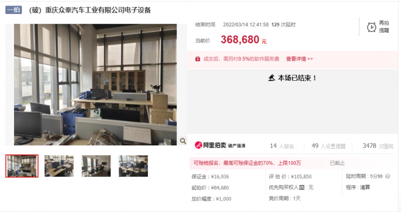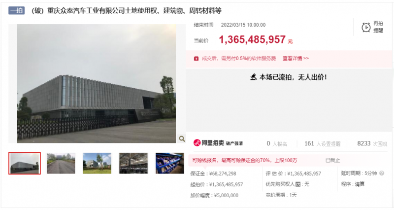 2022年3月14日至3月15日,重慶眾泰汽車(chē)工業(yè)有限公司(重慶眾泰汽車(chē)工業(yè))管理人在淘寶網(wǎng)司法強(qiáng)清拍賣(mài)平臺(tái),對(duì)位于重慶市璧山區(qū)璧泉街道的約628畝土地、建筑物、原材料等進(jìn)行公開(kāi)拍賣(mài),起拍價(jià)約13.65億元。最終無(wú)人繳納保證金入場(chǎng),而宣告流標(biāo)。