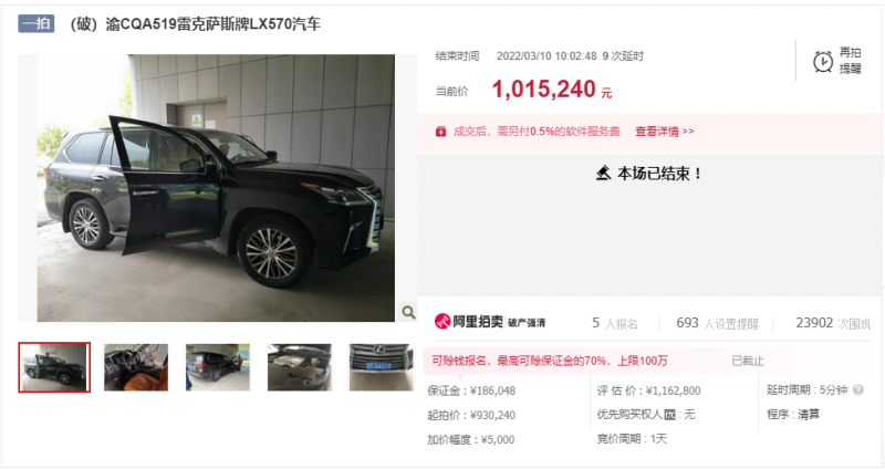 而從3月9日開(kāi)始拍賣(mài)的其他23項(xiàng)資產(chǎn),其中已經(jīng)有7項(xiàng)成交,其中雷克薩斯牌LX570汽車(chē)拍出101.524萬(wàn)元。