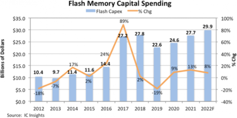 IC Insights預(yù)測(cè)今年NAND閃存資本支出將增長(zhǎng)8%至299億美元,超過(guò)2018年278億美元的歷史最高記錄(如下圖)。閃存資本支出在2017年飆升,當(dāng)時(shí)該行業(yè)向3D NAND轉(zhuǎn)型,此后每年都超過(guò)200億美元。2022年,閃存的資本支出預(yù)計(jì)將增至299億美元,因?yàn)榇笮凸?yīng)商和小型供應(yīng)商將保持適度激進(jìn)的支出水平。