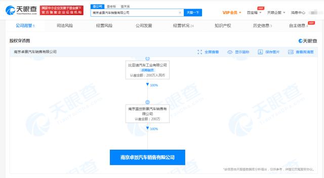 天眼查App顯示,近日,南京卓景汽車銷售有限公司成立,法定代表人謝國慶,注冊資本200萬人民幣,經(jīng)營范圍包括新能源汽車整車銷售;充電樁銷售;汽車零配件批發(fā);機(jī)動(dòng)車修理和維護(hù)等。股權(quán)穿透圖顯示,該公司由比亞迪汽車工業(yè)有限公司間接全資控股。