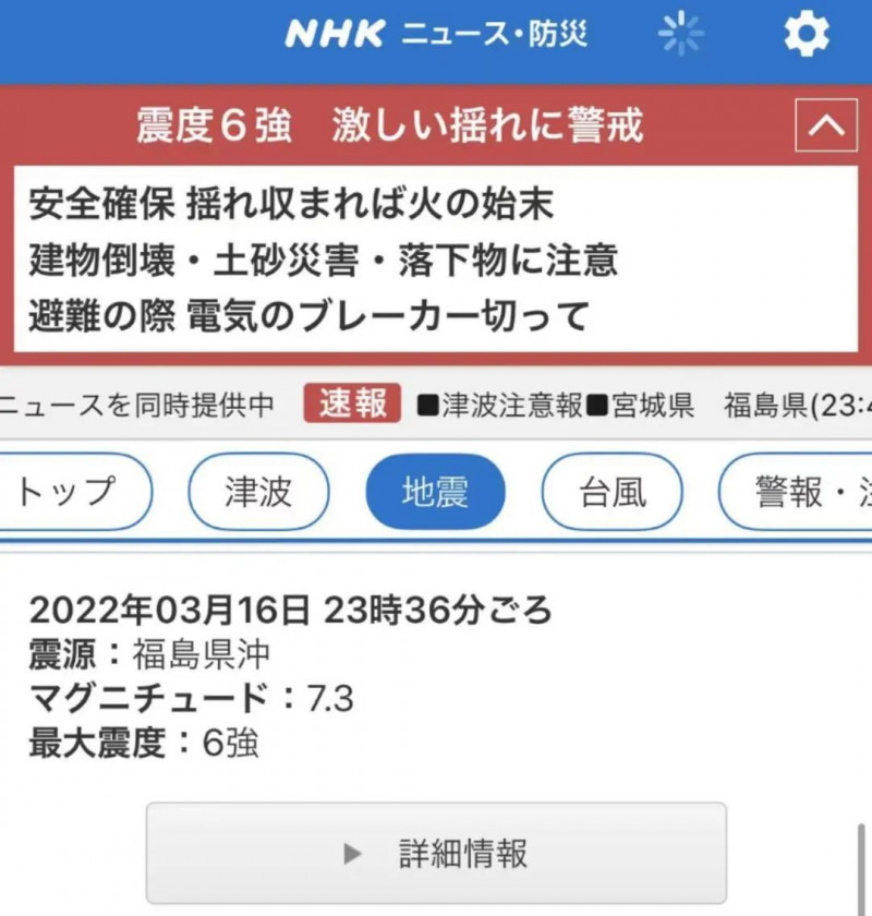 日本廣播協(xié)會(huì)發(fā)布消息,日本福島東北部海岸發(fā)生7.3級(jí)強(qiáng)烈地震,造成1人死亡,69人受傷,部分地區(qū)發(fā)生火災(zāi)。福島縣和宮城縣預(yù)測(cè)恐有一公尺海嘯,當(dāng)局已發(fā)布警報(bào),呼吁民眾立即避難。