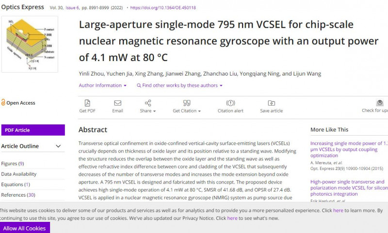 中國(guó)科學(xué)院長(zhǎng)春光學(xué)精密機(jī)械與物理研究所大功率半導(dǎo)體激光器研究團(tuán)隊(duì)近年來(lái)一直深耕量子傳感專(zhuān)用VCSEL芯片研發(fā),于2014年研制出原子鐘專(zhuān)用高溫VCSEL芯片。近日,該團(tuán)隊(duì)等研究人員在量子陀螺專(zhuān)用VCSEL芯片研發(fā)方面獲進(jìn)展,通過(guò)解決VCSEL的模式穩(wěn)定性和輸出功率相互制約的關(guān)鍵問(wèn)題,實(shí)現(xiàn)大氧化孔徑下VCSEL的單模工作。研制出的器件在80℃下輸出功率達(dá)到4.1 mW,邊模抑制比41.68dB,正交偏振抑制比27. 6dB,該芯片作為量子陀螺的光源,測(cè)試效果良好,說(shuō)明其具有較好的實(shí)際應(yīng)用價(jià)值。相關(guān)成果以 Large-aperture single-mode 795 nm VCSEL for chip-scale nuclear magnetic resonance gyroscope with an output power of 4.1 mW at 80℃為題發(fā)表在Optics Express上。