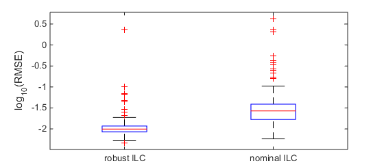 圖2 數(shù)據(jù)驅動迭代學習控制算法應用于控制一種非線性的酸堿中和反應過程(pH neutralization process)的結果。其中robust ILC和nominal ILC分別為考慮或不考慮參數(shù)隨機誤差的魯棒ILC算法的結果。