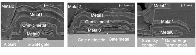 在 200 mm GaN-on-SOI 襯底上制造的高壓組件的工藝橫截面 (a) e 模式 pGaN-HEMT (b) d 模式 MIS-HEMT,(c) 肖特基勢壘二極管。所有器件都包括基于前端和互連金屬層并由介電層隔開的金屬場板