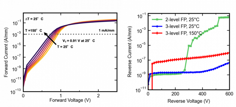 制造的 GET-SBD 的特性顯示(左)在 25°C 下以半對數(shù)刻度顯示 0.91V 的低開啟電壓,以及(右)兩種不同陽極的低反向漏電流(25°C 時為 2 nA/mm)在 25 和 150°C 下評估的場板配置。