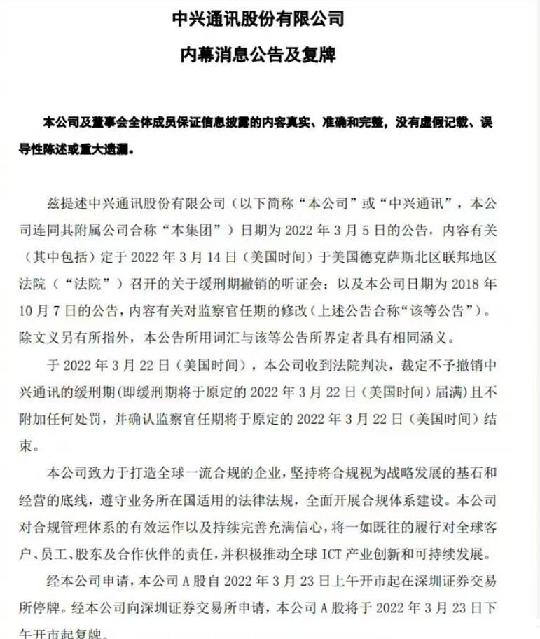 今早,中興通訊在港交所發(fā)公告擬披露重大事項,開市起臨時停牌,以待刊發(fā)內(nèi)幕消息公告,內(nèi)容有關(guān)2022年3月14日(美國時間)于美國法院召開的關(guān)于緩刑期撤銷的聽證會的進(jìn)展情況。