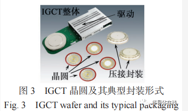 在晶閘管發(fā)明后的幾十年,陸續(xù)研究開發(fā)了雙向晶閘管、光觸發(fā)晶閘管和非對(duì)稱晶閘管等新型結(jié)構(gòu)器件 [3],極大地豐富了晶閘管家族,為交直傳動(dòng)和高壓直流輸電等大功率應(yīng)用提供了更多的選擇。為了克服晶閘管無法通過柵極關(guān)斷的弱點(diǎn),門極可關(guān)斷晶閘管(Gate Turn-off Thyristor, GTO)于 1960 年被推出 [4] ,通過門極環(huán)繞分立陰極并聯(lián)、降低導(dǎo)通時(shí)飽和深度等結(jié)構(gòu)與工藝優(yōu)化,實(shí)現(xiàn)了門極關(guān)斷控制,極大地簡化了復(fù)雜的配套電路,提高了可靠性。目前,GTO 容量已達(dá)到 10 kA/10 kV,在各種自關(guān)斷型器件中容量最大,在電力系統(tǒng)等領(lǐng)域具有明顯優(yōu)勢。1997 年,瑞士ABB 公司研發(fā)的集成門極換流晶閘管(Integrated GateCommutated Thyristor, IGCT)將 GTO 單元、反并聯(lián)二極管和驅(qū)動(dòng)控制電路集成在一起(IGCT 晶圓和典型封裝形式如圖 3 所示),成為一種具有低成本、低損耗、高功率密度和高可靠性的新型器件 [5] 。