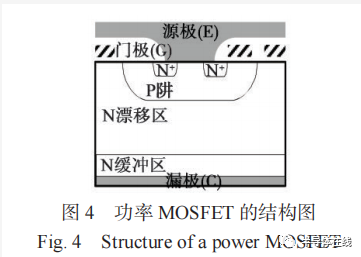1959 年,美國貝爾實(shí)驗(yàn)室開發(fā)出 MOSFET[6],并將其應(yīng)用于集成電路領(lǐng)域。功率 MOSFET 結(jié)構(gòu)如圖 4所示,采用傳統(tǒng) MOSFET 設(shè)計(jì)原理,通過大量元胞并聯(lián)和垂直導(dǎo)電結(jié)構(gòu),實(shí)現(xiàn)高耐壓和大電流能力,通過改變“柵極 - 源極”之間的電壓,控制器件開關(guān)狀態(tài)。功率 MOSFET 是一種壓控型器件,具有輸入阻抗高、開關(guān)速度快和驅(qū)動(dòng)電路設(shè)計(jì)簡單的特點(diǎn),更容易實(shí)現(xiàn)應(yīng)用系統(tǒng)的集成化,具有正溫度系數(shù),有利于多個(gè)器件的并聯(lián)使用。功率 MOSFET 通過多數(shù)載流子導(dǎo)電,其開關(guān)速度很快,工作頻率很高,但隨著器件耐壓提高,通態(tài)電阻急劇增大,二者形成相互制約,限制了其在高壓系統(tǒng)中的應(yīng)用。