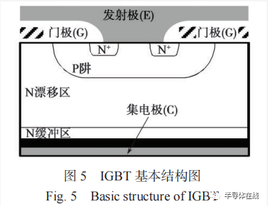 在 20 世紀(jì) 80 年代初,通過把 MOSFET 與 BJT 的技術(shù)優(yōu)點(diǎn)結(jié)合,促成了新型功率器件絕緣柵雙極型晶體管(Insulated Gate Bipolar Transistor, IGBT)的發(fā)明 [7] ,其思路是通過電壓控制的 MOSFET 給 BJT 提供基極電流,實(shí)現(xiàn)器件的高輸入阻抗和低導(dǎo)通損耗。IGBT 由美國 GE 公司和 RCA 公司于 1983 年推出,并于 1986年開始形成系列化產(chǎn)品,結(jié)構(gòu)如圖 5 所示,當(dāng)“柵極- 發(fā)射極”之間的電壓超過 MOSFET 的柵極閾值電壓時(shí),MOS 溝道打開,向 PNP 型 BJT 基極注入電流,開通 BJT。由于集電極側(cè) P 型半導(dǎo)體向 N 型基區(qū)注入少子,在基區(qū)中形成了電導(dǎo)調(diào)制效應(yīng),可在保證耐壓的同時(shí),極大地降低導(dǎo)通電阻,形成了耐壓與導(dǎo)通電阻的良好折衷關(guān)系。IGBT 集 MOSFET 電壓控制特性和 BJT 低導(dǎo)通電阻特性于一體,具有驅(qū)動(dòng)簡單、驅(qū)動(dòng)功率小、輸入阻抗大、導(dǎo)通電阻小、開關(guān)損耗低、工作頻率高等特點(diǎn),繼承了 MOSFET 較寬的安全工作區(qū)(Safe Operation Area, SOA)特性,是電力電子器件家族中最重要的成員之一。IGBT 經(jīng)歷了平面穿通型、平面非穿通型、溝槽柵場截止型和精細(xì)溝槽柵型等 7 代結(jié)構(gòu)的迭代優(yōu)化,并衍生出了逆導(dǎo)型 IGBT(Reverse Conducting IGBT, RC-IGBT)、逆阻型 IGBT (Reverse Blocking IGBT, RB-IGBT)和超級(jí)結(jié)型 IGBT(Super Junction IGBT, SJ-IGBT)等新型器件結(jié)構(gòu)。