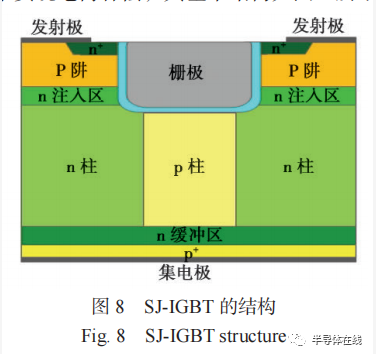 SJ-IGBT 通過在傳統(tǒng) MOSFET 的漂移區(qū)中引入超結(jié)結(jié)構(gòu),可達(dá)到導(dǎo)通損耗的明顯降低 [10];通過優(yōu)化電場分布實(shí)現(xiàn)在超薄芯片上保持所需的擊穿電壓。SJ IGBT 漂移區(qū)由摻雜極性相反但凈摻雜濃度相等的柱構(gòu)成,用來實(shí)現(xiàn)電荷補(bǔ)償,其基本結(jié)構(gòu)如圖 8 所示。