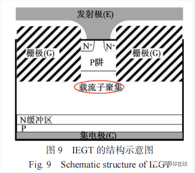 20 世紀(jì) 90 年代,注入增強(qiáng)柵晶體管(Injection Enhanced Gate Transistor, IEGT)[12] 由東芝公司提出,并開始替代 GTO。IEGT 的結(jié)構(gòu)示意如圖 9 所示,其元胞結(jié)構(gòu)與 IGBT 類似,但其柵極比 IGBT 更深更寬,增加了柵極至發(fā)射極的電阻,阻止載流子流過發(fā)射極側(cè)以增加 N 型基區(qū)中發(fā)射極附近載流子濃度,這種結(jié)構(gòu)在較高“集電極 - 發(fā)射極”電壓的情況下,有助于減小導(dǎo)通壓降。