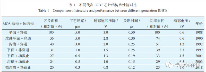 第 1 代至第 7 代 IGBT 的結(jié)構(gòu)和性能對(duì)比如表 1 [11]所示,每一代 IGBT 芯片在電流密度、耐壓性能、開關(guān)性能和導(dǎo)通性能方面,都比上一代產(chǎn)品更具明顯優(yōu)勢,達(dá)到了對(duì)半導(dǎo)體材料更高效利用的目的。