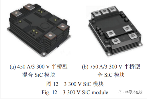 為適應(yīng)軌道交通綠色、環(huán)保和智能的發(fā)展要求,配合新一代高性能牽引變流器研究,基于 6 英寸 SiC芯片生產(chǎn)線工藝能力,設(shè)計(jì)開發(fā)了 32 A/3 300 V、47 A/3 300 V SiC MOSFET 和配套的肖特基二極管(Schottky Barrier Diode, SBD),開展了 SiC 芯片低感封裝技術(shù)研究與工藝探索,研制了如圖 12 所示的450 A/3 300 V 半橋型混合 SiC 模塊和 750 A/3 300 V 半橋型全 SiC 模塊 [28-29] 。