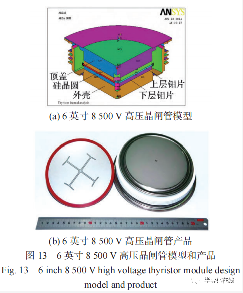 在國產(chǎn)功率器件服務(wù)中國軌道交通的 40 余年,在高壓大功率晶閘管設(shè)計(jì)與制造領(lǐng)域積累了豐富經(jīng)驗(yàn),自主研發(fā)并掌握了先進(jìn)的全壓接技術(shù)。2006 年初,面向國家特高壓直流輸電重大戰(zhàn)略需求,配合國家電網(wǎng)公司開始研制 6 英寸高壓直流輸電晶閘管。通過鋁雜質(zhì)源轉(zhuǎn)移擴(kuò)散方法 [30],優(yōu)化雜質(zhì)分布,突破了高溫深結(jié)擴(kuò)散、雙負(fù)斜角臺(tái)面造型和防爆封裝等關(guān)鍵技術(shù),研制出全球第 1 只 6 英寸 4 000 A/8 000 V 高壓晶閘管 [31-32];基于靈寶背靠背直流工程需要,設(shè)計(jì)開發(fā)了6 英寸 4 500 A/7 200 V 晶閘管;經(jīng)過多輪技術(shù)迭代和工程驗(yàn)證,自主研發(fā)了 ±1 100 kV 特高壓直流輸電用6 英寸 5 000 A/8 500 V 晶閘管 [33](如圖 13 所示),并先后完成國內(nèi)外 20 余個(gè)高壓直流輸電工程項(xiàng)目應(yīng)用。我國晶閘管技術(shù)實(shí)現(xiàn)行業(yè)領(lǐng)跑,支撐了特高壓直流輸電技術(shù)與產(chǎn)業(yè)可持續(xù)發(fā)展。