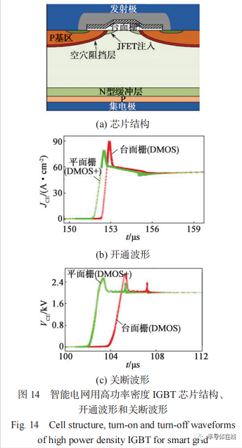 隨著新能源的大規(guī)模開發(fā)利用和接入并網(wǎng),以及柔性直流輸電技術(shù)的發(fā)展,行業(yè)對(duì)具有自主關(guān)斷能力的大功率半導(dǎo)體器件提出了迫切需求 [34-36]?;陔娋W(wǎng)系統(tǒng)應(yīng)用特點(diǎn)和對(duì)產(chǎn)品參數(shù)均勻性的要求,通過引入 JFET區(qū)注入、空穴阻擋層 (Hole Barrier) 和臺(tái)面柵 (TerraceGate) 等元胞優(yōu)化技術(shù),實(shí)現(xiàn)改進(jìn)型 IGBT 元胞設(shè)計(jì),提升了 IGBT 芯片整體性能,同時(shí)基于此設(shè)計(jì)開發(fā)了智能電網(wǎng)用焊接型高功率密度 1 500 A/3 300 V IGBT模塊,其芯片結(jié)構(gòu)和模塊開關(guān)特性如圖 14 所示 [37] ,該產(chǎn)品已在廈門柔直和渝鄂背靠背等工程中獲得成功。
