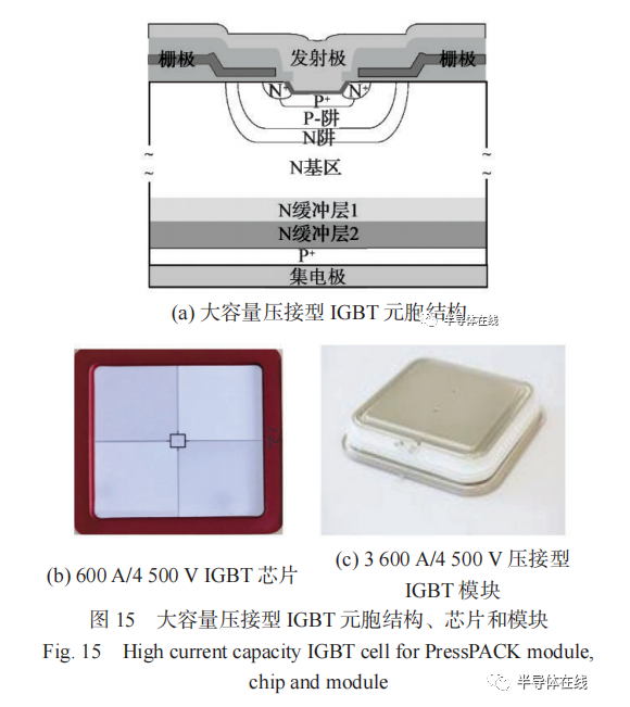 隨著電力系統(tǒng)的電力電子柔性化進(jìn)程加快,焊接型 IGBT 模塊在容量、效率、電路拓?fù)浜涂煽啃缘确矫娑茧y以滿足應(yīng)用需求,而壓接型 IGBT 作為一種容量更大、更易串聯(lián)應(yīng)用的新型封裝形式,是高壓柔性直流輸配電技術(shù)的關(guān)鍵核心器件。基于應(yīng)用需求,對(duì)大規(guī)模 IGBT 芯片壓接封裝過程中面臨的“機(jī) - 電 - 熱”強(qiáng)耦合條件下的芯片均流原理已有了深入研究 [38-40] :文獻(xiàn) [40] 首次完成了大尺寸 IGBT 芯片設(shè)計(jì)研究,及其力學(xué)增強(qiáng)、方形陶瓷管殼和壓接封裝等關(guān)鍵技術(shù)研究;文獻(xiàn) [38] 提出了 IGBT 低時(shí)延?xùn)艠O互連與元胞柵電阻結(jié)構(gòu),完成了 IGBT 元胞開關(guān)同步與均流控制技術(shù)研究,開發(fā)了全球最大容量的 600 A/4 500 V IGBT 芯片;文獻(xiàn) [39] 提出了 IGBT 大芯片低溫銀燒結(jié)工藝與芯片增強(qiáng)技術(shù),解決了高壓 IGBT 壓接封裝過程中的均壓和均流等技術(shù)難題,研制了低損耗和高關(guān)斷能力的3 600 A/4 500 V 大容量壓接型 IGBT, 其元胞結(jié)構(gòu)、芯片和模塊如圖 15 所示,產(chǎn)品在張北 ±500 kV 直流電網(wǎng)和烏東德 ±800 kV 特高壓直流輸電工程獲得成功應(yīng)用與推廣。