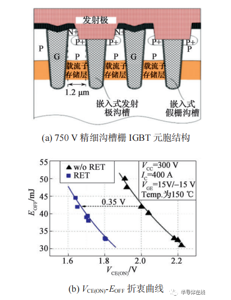 為了降低芯片損耗,薄片技術(shù)與精細(xì)溝槽成為主流發(fā)展方向,我國也開發(fā)了汽車用 IGBT 芯片的獨(dú)特結(jié)構(gòu)、技術(shù)和工藝 [43-44](如圖 17 所示),嵌入式發(fā)射極溝槽 IGBT (Recessed Emitter Trench IGBT, RETIGBT)芯片通態(tài)損耗同比降低 15% 以上,與國外同類產(chǎn)品相比,柵極電阻對(duì)開關(guān)損耗具有更好的調(diào)控效果。圖 17(c) 實(shí)線與虛線分別代表國外主流產(chǎn)品與國產(chǎn) IGBT,藍(lán)線與紅線分別代表關(guān)斷損耗與開通損耗。