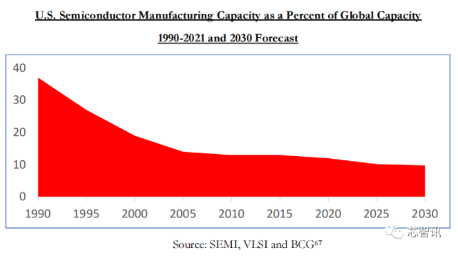 1990-2021年和2030年美國半導體制造業(yè)產能占全球產能的百分比預測