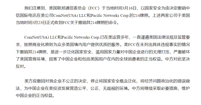 3月24日, 中國(guó)工業(yè)和信息化部針對(duì)美撤銷中信國(guó)際電訊在美公司214牌照事項(xiàng)發(fā)表聲明稱:堅(jiān)決反對(duì)。