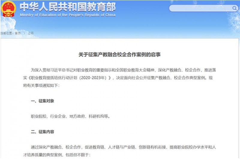 2021年7月,教育部職業(yè)教育與成人教育司發(fā)布《關(guān)于征集產(chǎn)教融合校企合作案例的啟事》,面向社會(huì)公開(kāi)征集產(chǎn)教融合、校企合作案例,具體內(nèi)容為通過(guò)深化產(chǎn)教融合、校企合作,促進(jìn)教育鏈、人才鏈與產(chǎn)業(yè)鏈、創(chuàng)新鏈有機(jī)銜接,提高職業(yè)院校辦學(xué)水平和人才培養(yǎng)質(zhì)量的典型案例。