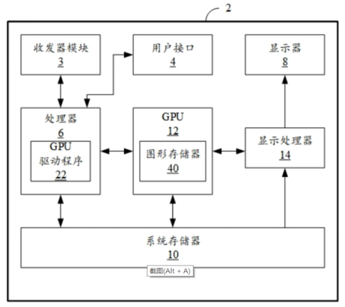 圖1為計(jì)算裝置框圖,其中包括:處理器6、系統(tǒng)存儲(chǔ)器10和GPU12。還可包含顯示處理器14、收發(fā)器模塊3、用戶接口4和顯示器8。收發(fā)器模塊和顯示處理器可為與處理器和/或GPU相同的集成電路(IC)的部分。處理器可為微處理器,例如中央處理單元(CPU),其經(jīng)配置以處理供執(zhí)行的計(jì)算機(jī)程序的指令。處理器可包括控制計(jì)算裝置的運(yùn)算的通用或?qū)S锰幚砥鳌S脩艨蓪⑤斎胩峁┑接?jì)算裝置,以致使處理器執(zhí)行一或多個(gè)軟件應(yīng)用程序。另外處理器還可以執(zhí)行控制GPU運(yùn)算的GPU驅(qū)動(dòng)程序22。用戶可經(jīng)由一或多個(gè)輸入裝置將輸入提供到計(jì)算裝置。