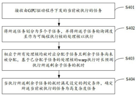 圖為應(yīng)用于GPU的確定任務(wù)復(fù)雜度方法流程示意圖,該方法包括:首先接收由GPU驅(qū)動(dòng)程序22下發(fā)的當(dāng)前被執(zhí)行的任務(wù)(S401);然后將所述任務(wù)劃分為多個(gè)子任務(wù),并將所述子任務(wù)輪詢調(diào)度至作為可編程執(zhí)行核24的處理核300以執(zhí)行(S402);相應(yīng)于所有處理核300均被對(duì)應(yīng)分配子任務(wù)且剩余子任務(wù)尚未被分配,基于已分配子任務(wù)的處理核300的warp執(zhí)行時(shí)長(zhǎng)預(yù)測(cè)執(zhí)行所述剩余子任務(wù)的耗時(shí)(S403);最后當(dāng)執(zhí)行所述剩余子任務(wù)的耗時(shí)滿足設(shè)定的判定條件時(shí),確定所述當(dāng)前被執(zhí)行的任務(wù)為高復(fù)雜度任務(wù)(S404)。